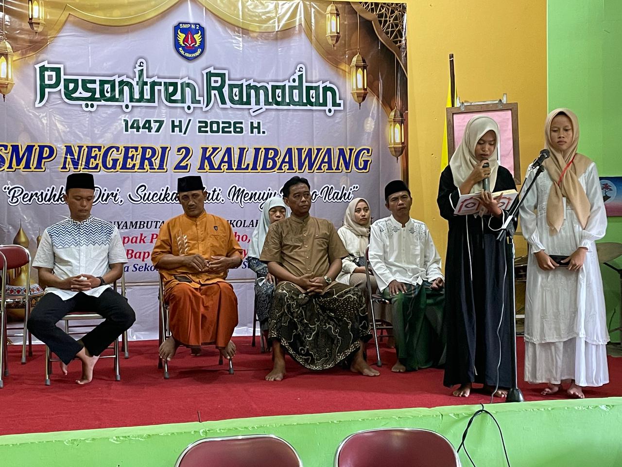 Rangkaian acara dibuka dengan pembacaan Kalam Ilahi yang dibawakan secara apik oleh ananda Rahayu dari kelas VIII B dan Fatih dari kelas VIII A. Lantunan ayat-ayat suci Al-Qur'an tersebut berhasil menciptakan suasana tenang dan khusyuk, membawa hati para hadirin untuk lebih meresapi makna keberkahan di bulan Ramadhan. Setelah pembukaan melalui lantunan wahyu Ilahi, acara dilanjutkan dengan menyanyikan lagu kebangsaan Indonesia Raya. Seluruh hadirin berdiri dengan tegak dan penuh semangat menyanyikan lagu wajib tersebut, sebagai bentuk penanaman jiwa nasionalisme di tengah kegiatan keagamaan.